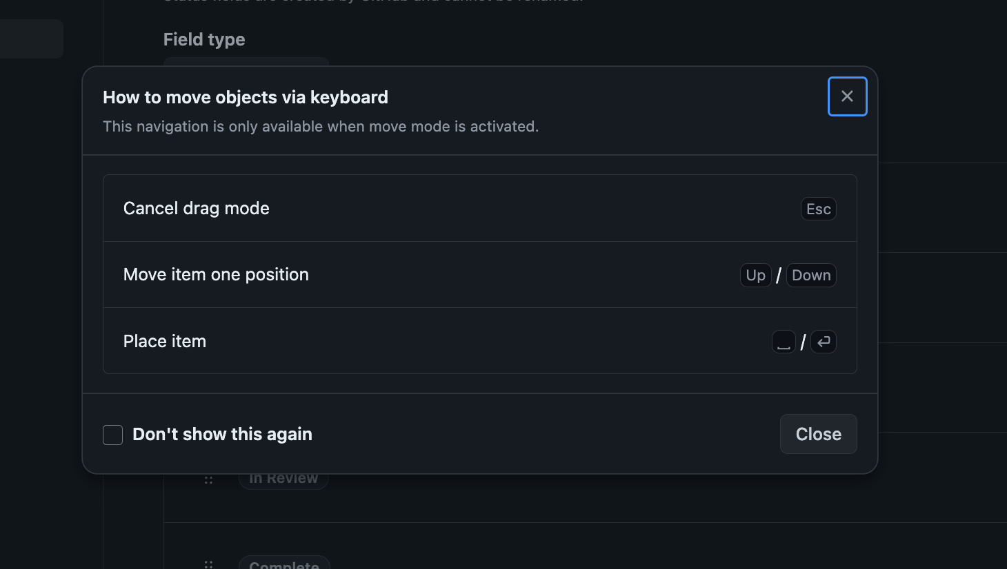 While not exclusive to accessibility best practices, it's important to acknowledge that many drag and drop patterns are neither keyboard nor screen reader accessible on the web. As a result, users with disabilities might not have had the opportunity to use drag and drop before, making the operations unfamiliar to them. To allow for a smooth onboarding, we recommend creating an accessible dialog that can educate users on how to navigate this specific drag and drop experience, particularly when drag and drop mode is activated. In addition, offering both a one time dismissal (close icon) and a "Don't show me this again" checkbox allows a user to learn at their own pace and comfort.